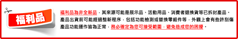 *提醒您,鑑賞/猶豫期非試用期,退貨商品(含贈品及部分加價購商品)須全新狀態且保持商品本體、配件、保證書、附隨文件、原廠內外包裝、裝箱明細等之完整。若有缺漏須酌收費用。( 清淨機整新費用NT$3000元;贈品則按市價補償)