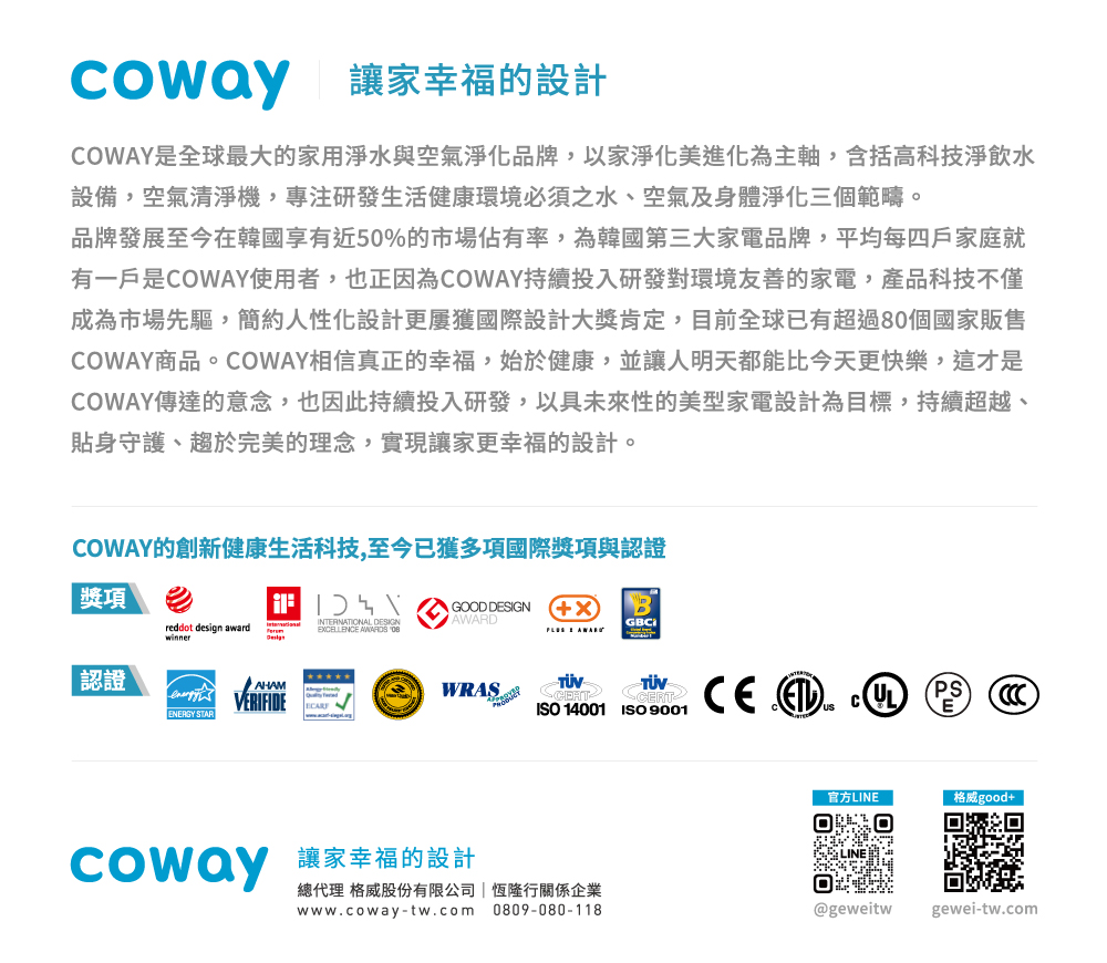 * Coway客服電話0809-080118,服務時間為周一至周五(例假日除外)9:30-12:00、13:00-17:30。